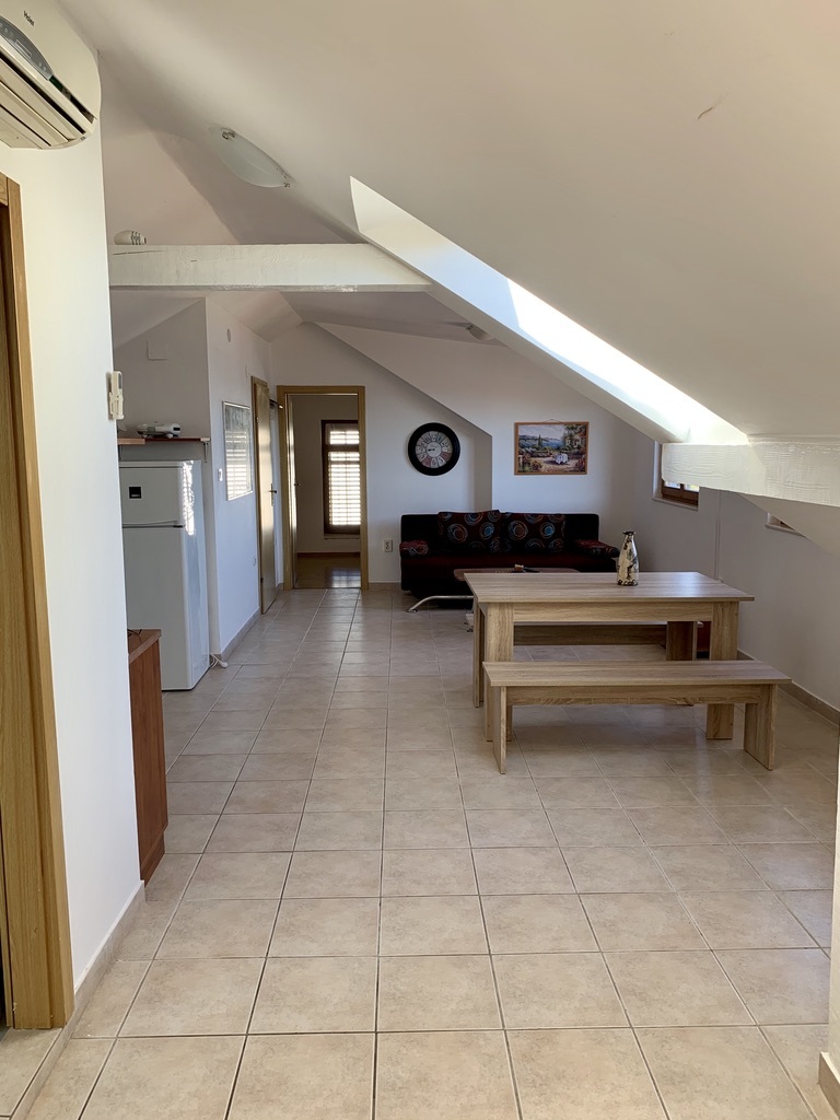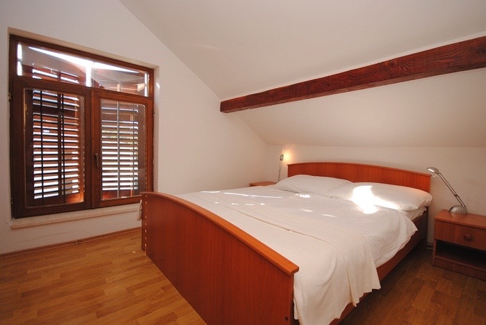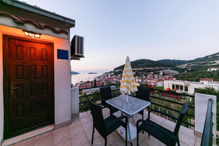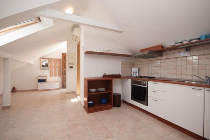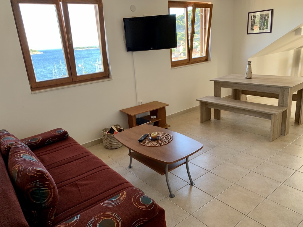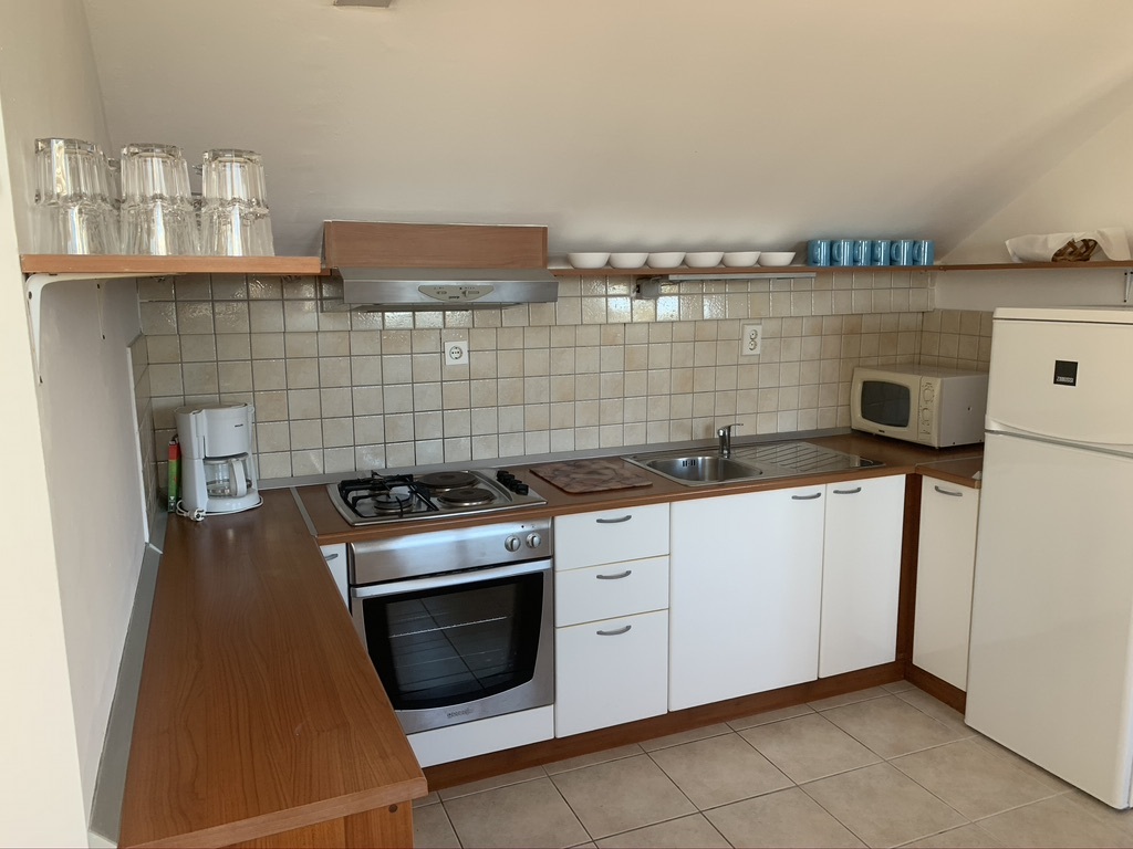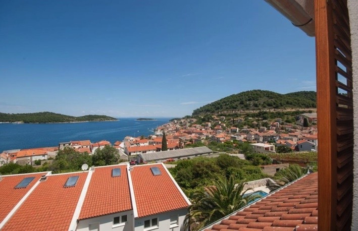 Located on the top floor of Villa Linné main building, this apartment is not part of the four terrace houses. The flat has it’s own entrance behind the main building, where a flight of stairs leads up to a terrace with a stunning view of the old port in Vis. It consists of 2 bedrooms, modernly equipped kitchen and bathroom with laundry machine. A fridge, freezer and microwave are featured in the kitchen.